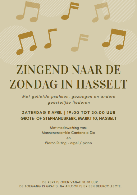 Zingend naar de zondag in HasseltKerk open: 18.30Toegang gratis Collecte bij de uitgang Medewerkenden: